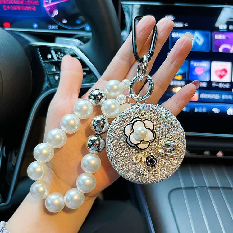 The mirror is adorned with sparkling rhinestones, pearls, and a silver bead, adding a touch of glamour.