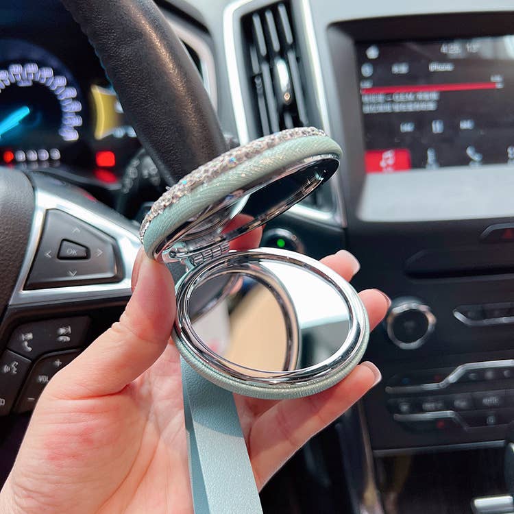 This stylish keychain features a round compact mirror that is perfect for touch-ups on the go.