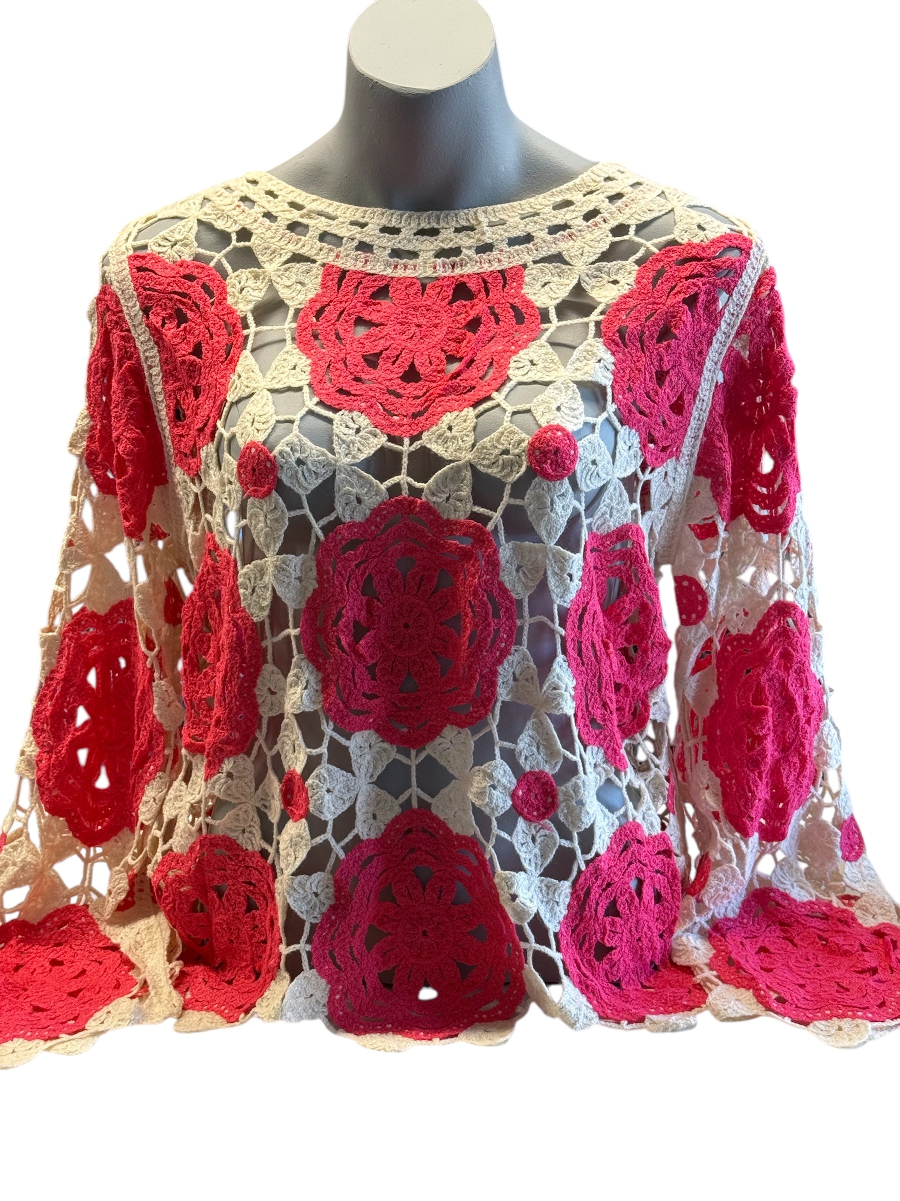 An oversized long sleeved round neck Italian crochet top with coloured crochet flower detail