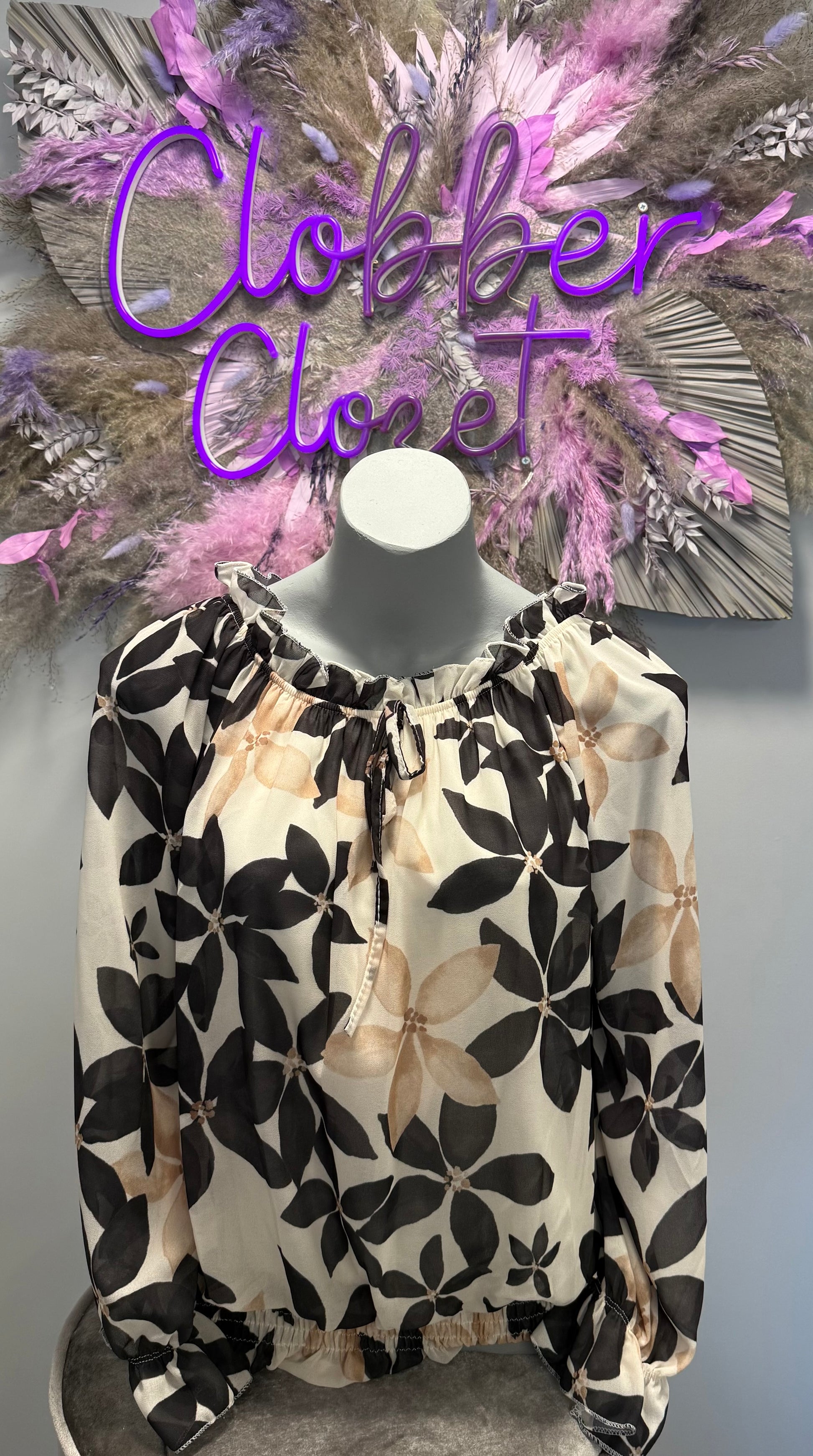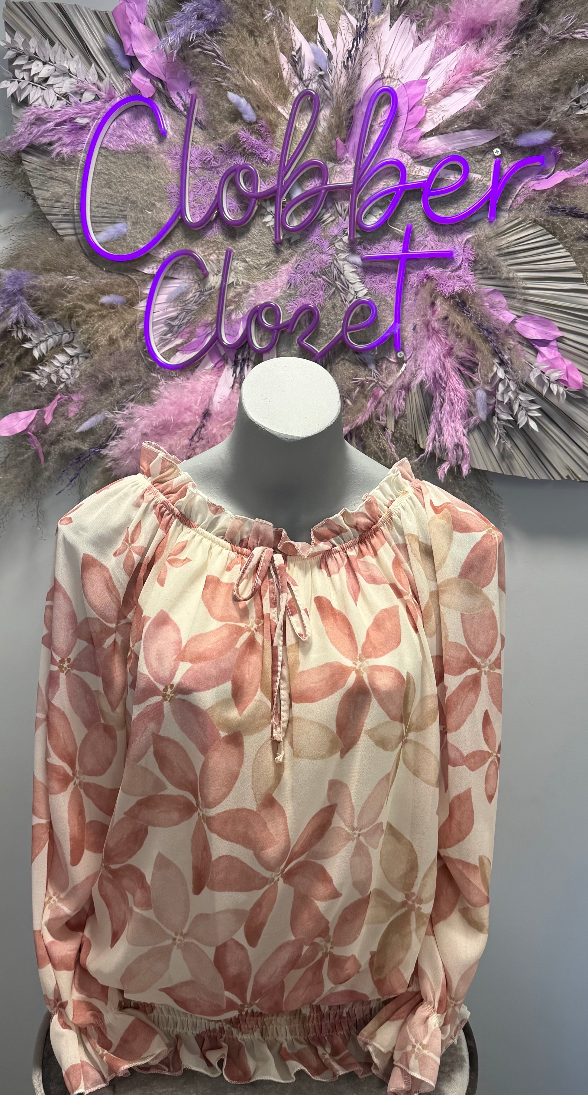 Stylish and trendy floral print blouse with ruffle elasticated stretch neckline which can be worn on or off the shoulder. Faux tie fastening. Long sleeves with stretch ruffle cuffs and stretch hem for relaxed fit. Fully lined.