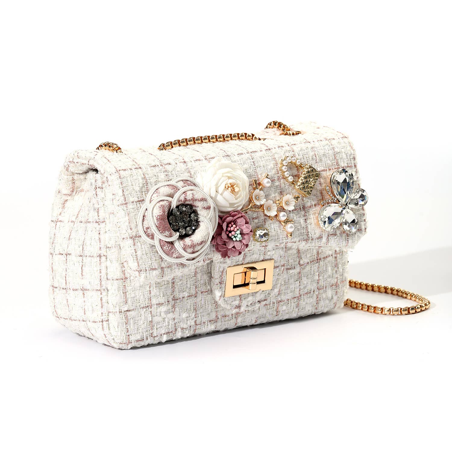 This elegant tweed bag is adorned with beautiful floral and crystal embellishments, adding a touch of vintage charm. The perfect accessory for any occasion!