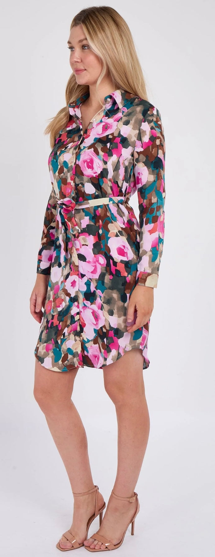 The Roses Print Teal Mini Shirt Dress showcases a vibrant floral pattern in rich teal tones, paired with a classic button-down front and a flattering tie belt.